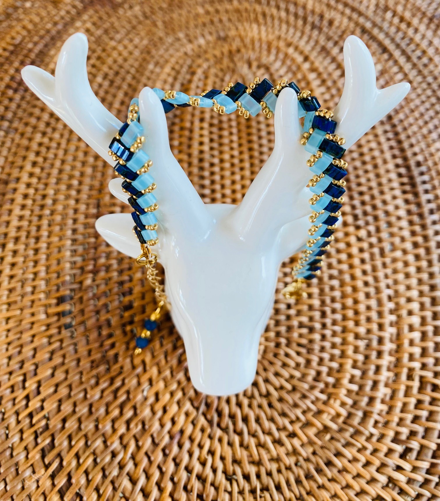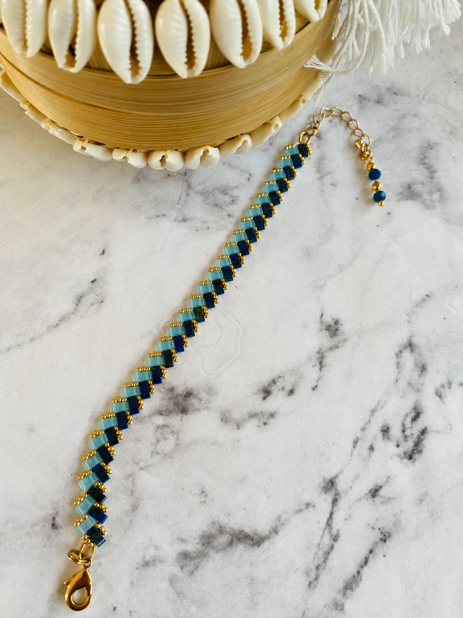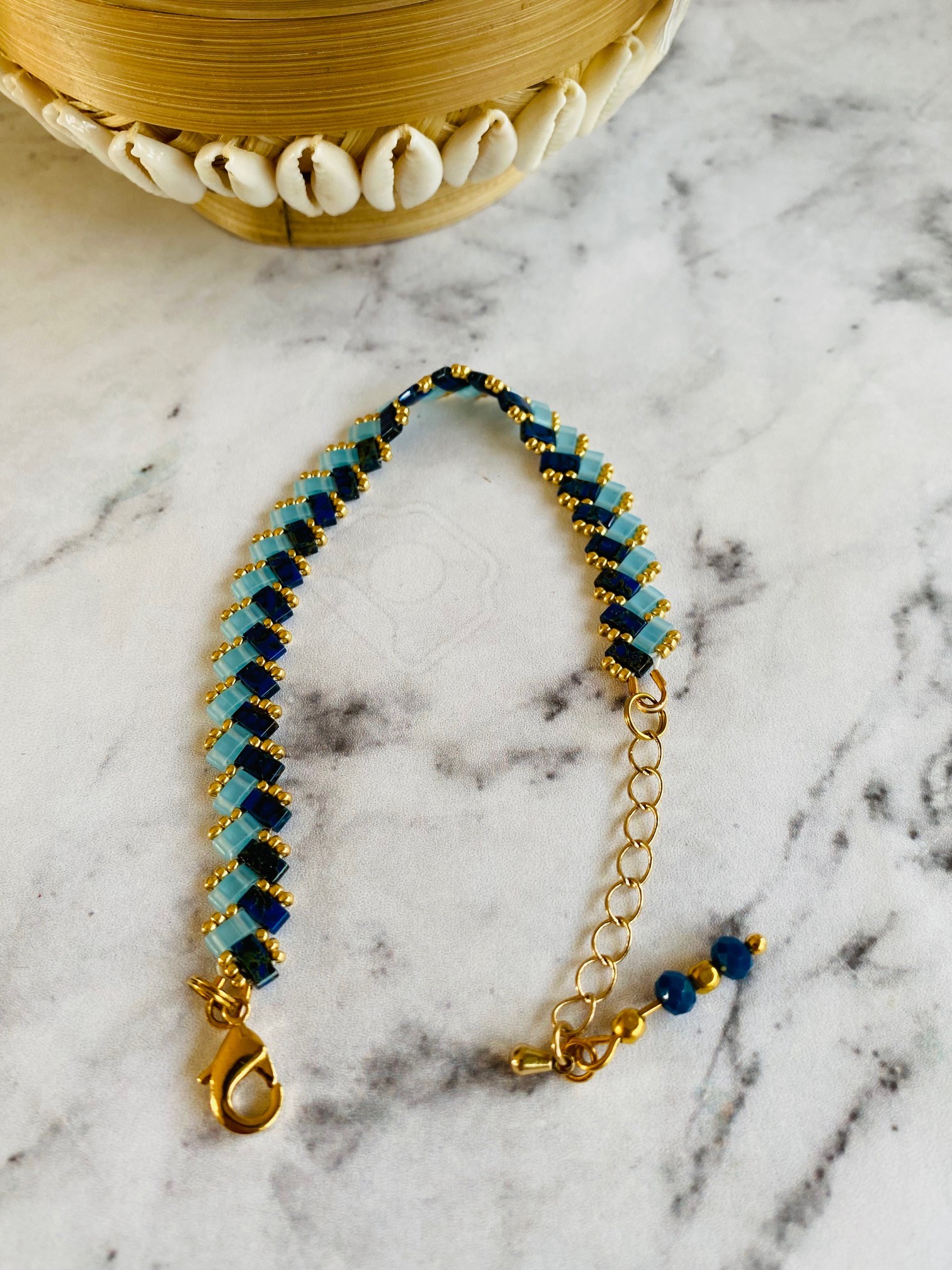 Bracelet dans les tons bleus tissé à la main sur 2 rangs en épi avec des perles half Tila Miyuki en verre et des rocailles dorées.
